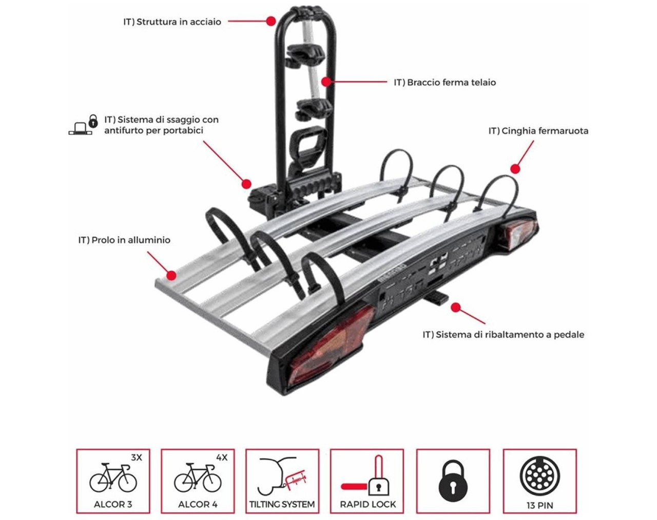 Fahrradträger Alcor für Anhängerkupplung für 3 Fahrräder: ideal für E-Bikes und FAT-BikesDer Alcor Fahrradträger ist für die Montage an der Anhängerkupplung konzipiert und bietet eine praktische und sichere Lösung für den Transport von bis zu drei Fahrrädern. Er ist besonders geeignet für E-Bikes und FAT-Bikes und gewährleistet eine optimale Kompatibilität mit verschiedenen Fahrradtypen. Kapazität: Transportiert bis zu 3 Fahrräder. Kompatibilität: Geeignet für E-Bikes und FAT-Bikes. Neigemechanismus: Erleichtert den Zugang zum Kofferraum, ohne den Fahrradträger entfernen zu müssen. Sicherheit: Ausgestattet mit einem Diebstahlschutzschloss für zusätzlichen Schutz.Der Alcor Fahrradträger ist die perfekte Wahl für alle, die eine zuverlässige und sichere Möglichkeit suchen, ihre Fahrräder zu transportieren, sei es für kurze Fahrten oder lange Reisen.