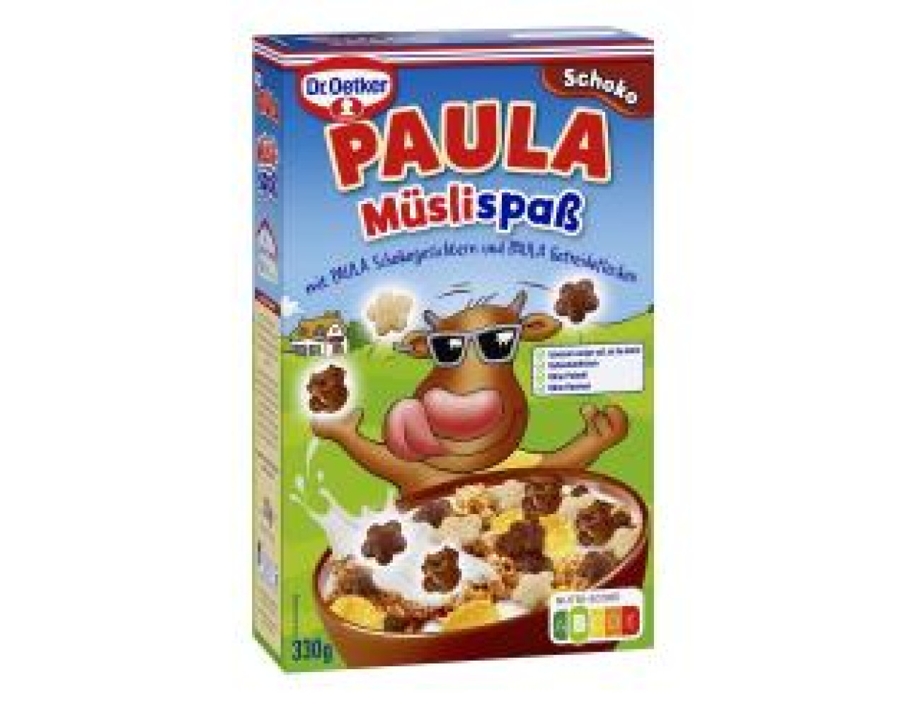 Paula gibt es nun auch im Müsliregal! Der Dr. Oetker Paula Müslispaß kommt in der beliebten Geschmacksrichtung Schoko und überzeugt die ganze Familie mit kuhlen Paula-Schokogesichtern und Getreideflecken. In Kombination mit unserem leckeren Knuspermüsli als Basis bietet es ein spaßiges Knuspererlebnis und schmeckt dabei weniger süß, als man denkt. Paula Müslispaß - ein echtes Highlight auf dem Frühstückstisch!