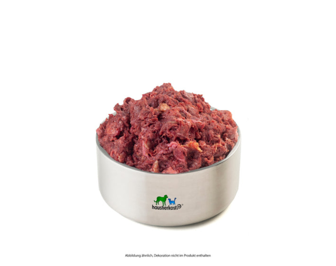 Muskelfleisch vom Pferd mit Knorpelanteilen, wenig Sehnen und Faszien, gemischt mit gekochten Kartoffeln. Pferdefleisch hat einen geringen Fett- und Cholesteringehalt. Es zeichnet sich durch einen hohen Anteil an Eiweißen und ungesättigten Fettsäuren aus. Geeignet für gesunde Rassen jeglichen Alters, insbesondere auch für viele sensible und allergische Hunde, z.B. im Zusammenhang mit einer Ausschlussdiät! (Nach Rücksprache mit dem Tierarzt oder Tierheilpraktiker.)