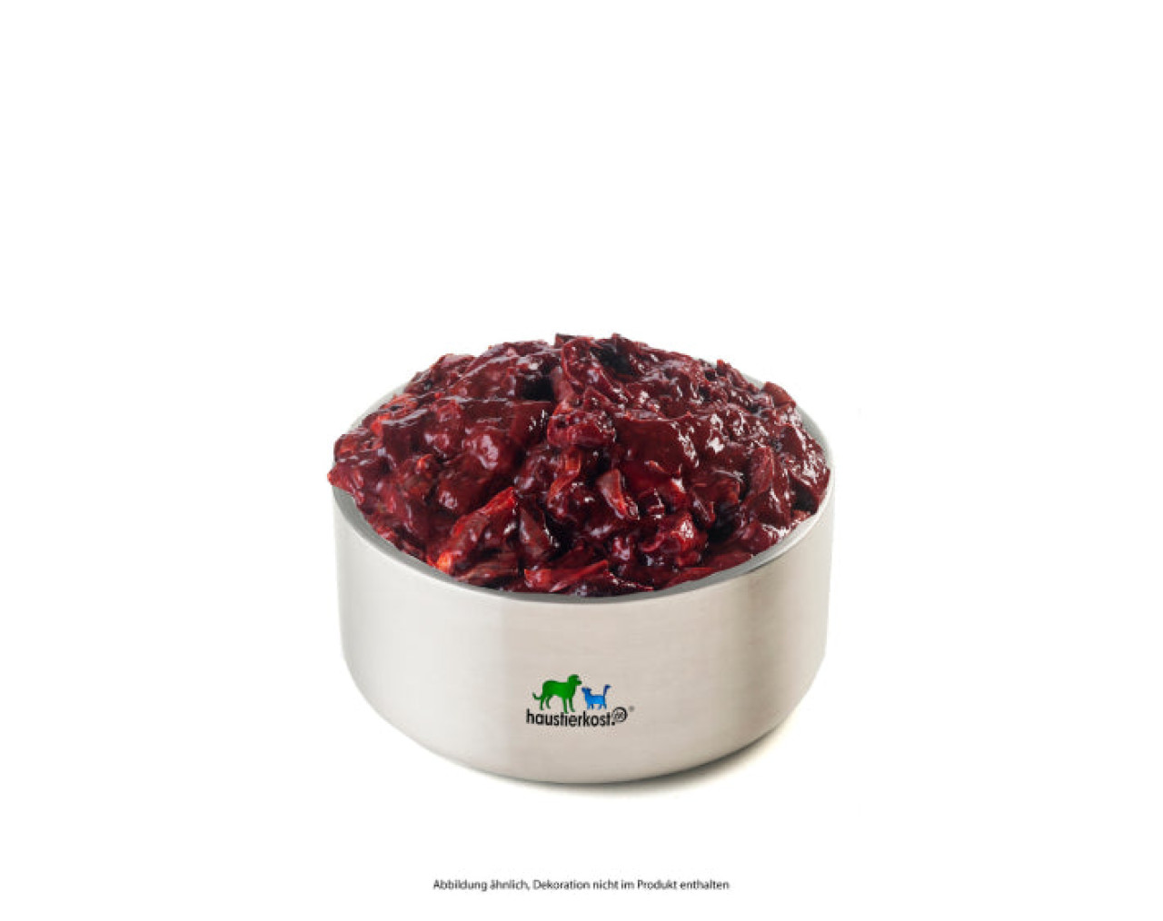 Rindermilz gewürfelt, 500 g Rindermilz liefert aufgrund des hohen Blutgehaltes sehr viel Eisen. Ergänzend zu Leber und Niere kann Rindermilz zwei bis dreimal pro Woche gefüttert werden. Eine etwaig grünliche Verfärbung des Produktes ist auf Oxidation zurückzuführen. Dies stellt keinen Qualitätsmangel dar.