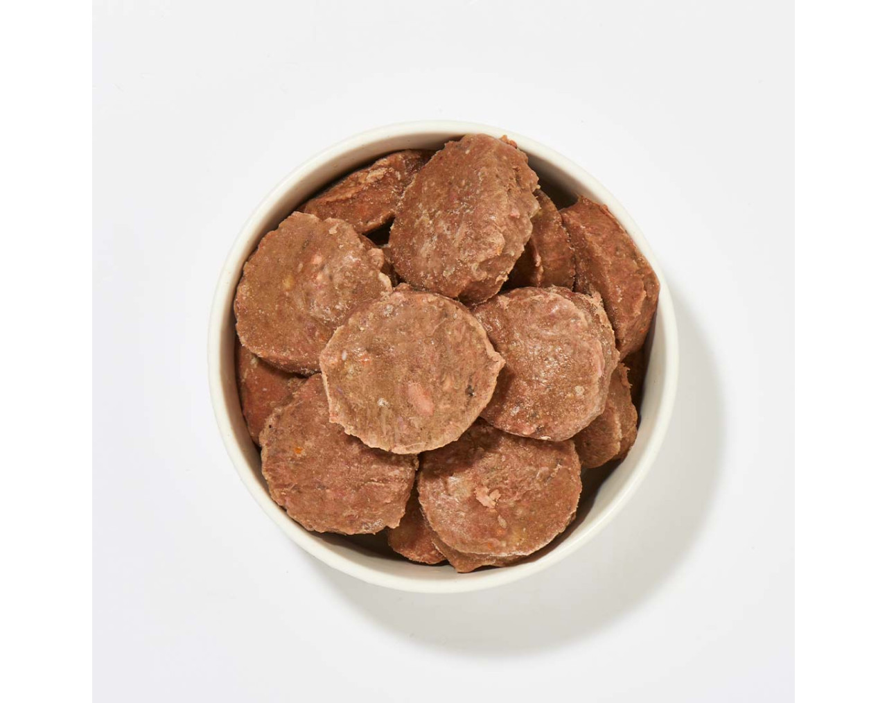 BARF Komfort PLUS Rind, 800 g Die Basis für unsere Mischung ist Rindfleisch, dazu grüner Rinderpansen, Kalbsbrustbein, Karotten, Rinderherz, Äpfel, Birnen und Rinderleber (natürlicher Vitamin A Lieferant), abgerundet mit gutem Leinöl (reich an Omega-3-Fettsäuren). Das gewünschte Kalzium-Phosphor-Verhältnis von 1,3:1 erreichen wir über die Zugabe von Algenkalk. Außerdem enthält unser Produkt Bierhefe, Traubenkernmehl, Seealgenmehl, Brennnessel, Brombeerblätter, Löwenzahn, Kamille und Mariendistel. (Bitte beachten Sie, dass sich das Kalzium-Phosphor-Verhältnis ändert, wenn Sie Getreide zufüttern.) 1 Taler wiegt ca. 30-33 g.