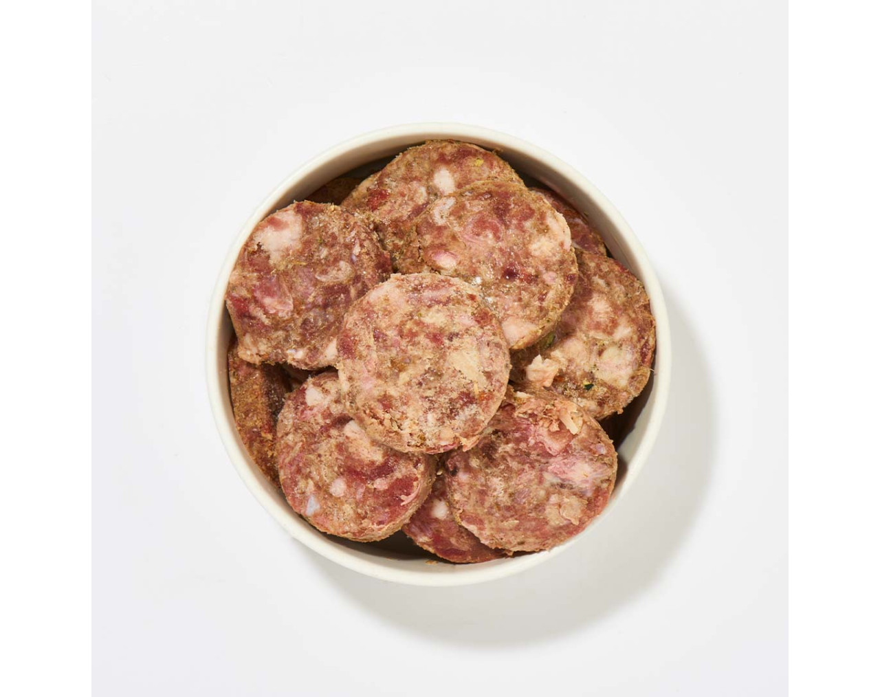 BARF Komfort PLUS Gans TALER, 800 g Unsere Mischung enthält Gänsehälse, Gänseherzen, Gänsekarkasse und Gänsemägen, sowie Karotten, Äpfel und Birnen. Abgerundet wird die Mischung mit Leinöl (reich an Omega-3-Fettsäuren). Außerdem enthält unser Produkt Algenkalk, Bierhefe, Traubenkernmehl, Seealgenmehl, Brennnessel, Brombeerblätter, Löwenzahn, Kamille und Mariendistel. Die Gänsehälse und -karkassen als natürliche Kalziumquellen tragen zu einem gewünschten Kalzium-Phosphor-Verhältnis bei. (Bitte beachten Sie, dass sich das Kalzium-Phosphor-Verhältnis ändert, wenn Sie Getreide zufüttern.) Der Artikel enthält Knochen als natürliche Calciumquelle. Bei der Fütterung ernährungssensibler Hunde sollte vorab eine Rücksprache mti dem Tierarzt erfolgen. 1 Taler wiegt ca. 30-33 g.