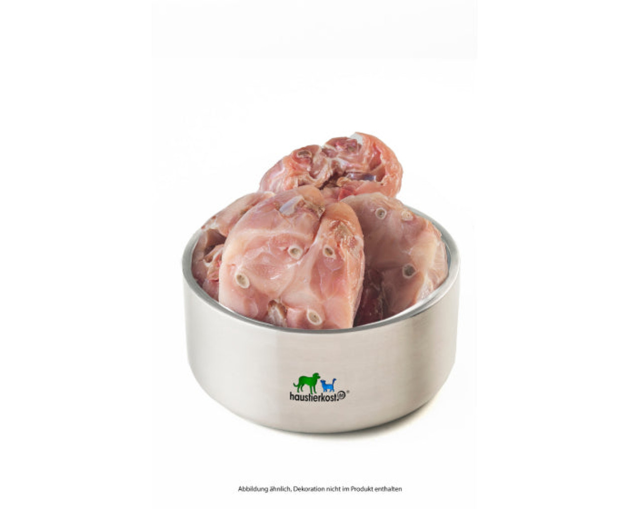 Ganzes Kaninchen ohne Fell, Kopf, Füße und Innereien in Stücke gesägt. Geeignet für alle gesunden ausgewachsenen Hunde mit Knochenerfahrung. Interessant auch für viele sensible und allergische Hunde , z.B. im Zusammenhang mit einer Ausschlussdiät! (Nach Rücksprache mit dem Tierarzt oder Tierheilpraktiker.)