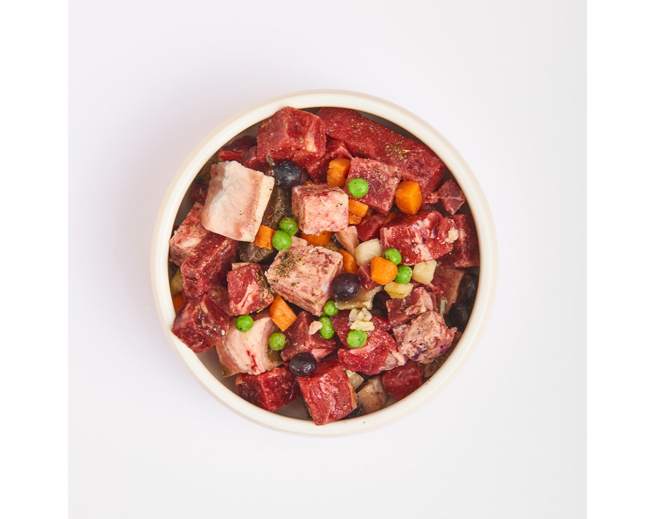 Die Basis bilden saftige Fleischstücke, Knochen, Pansen sowie alle wichtigen Innereien. Ergänzt wird das Menü durch wertvolles Obst und gedünstetes Gemüse. Durch das schonende Garen kann es vom Hund optimal verwertet werden, während Vitamine und Mineralien erhalten bleiben.