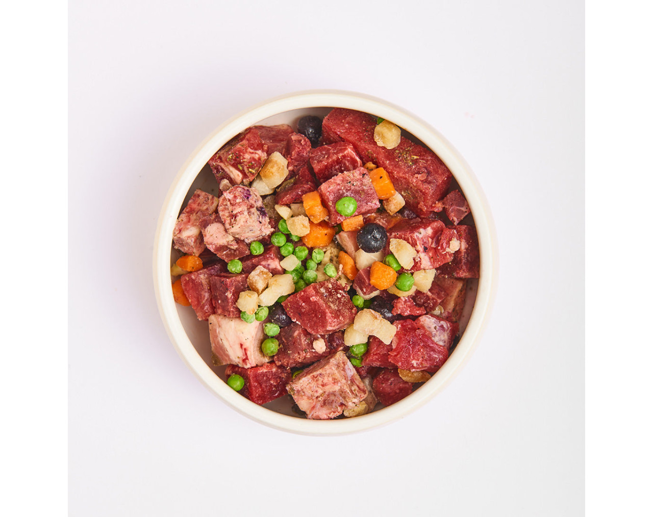 Die Basis bilden saftige Fleischstücke, Knochen sowie alle wichtigen Innereien. Ergänzt wird das Menü durch wertvolles Obst und gedünstetes Gemüse. Durch das schonende Garen kann es vom Hund optimal verwertet werden, während Vitamine und Mineralien erhalten bleiben.