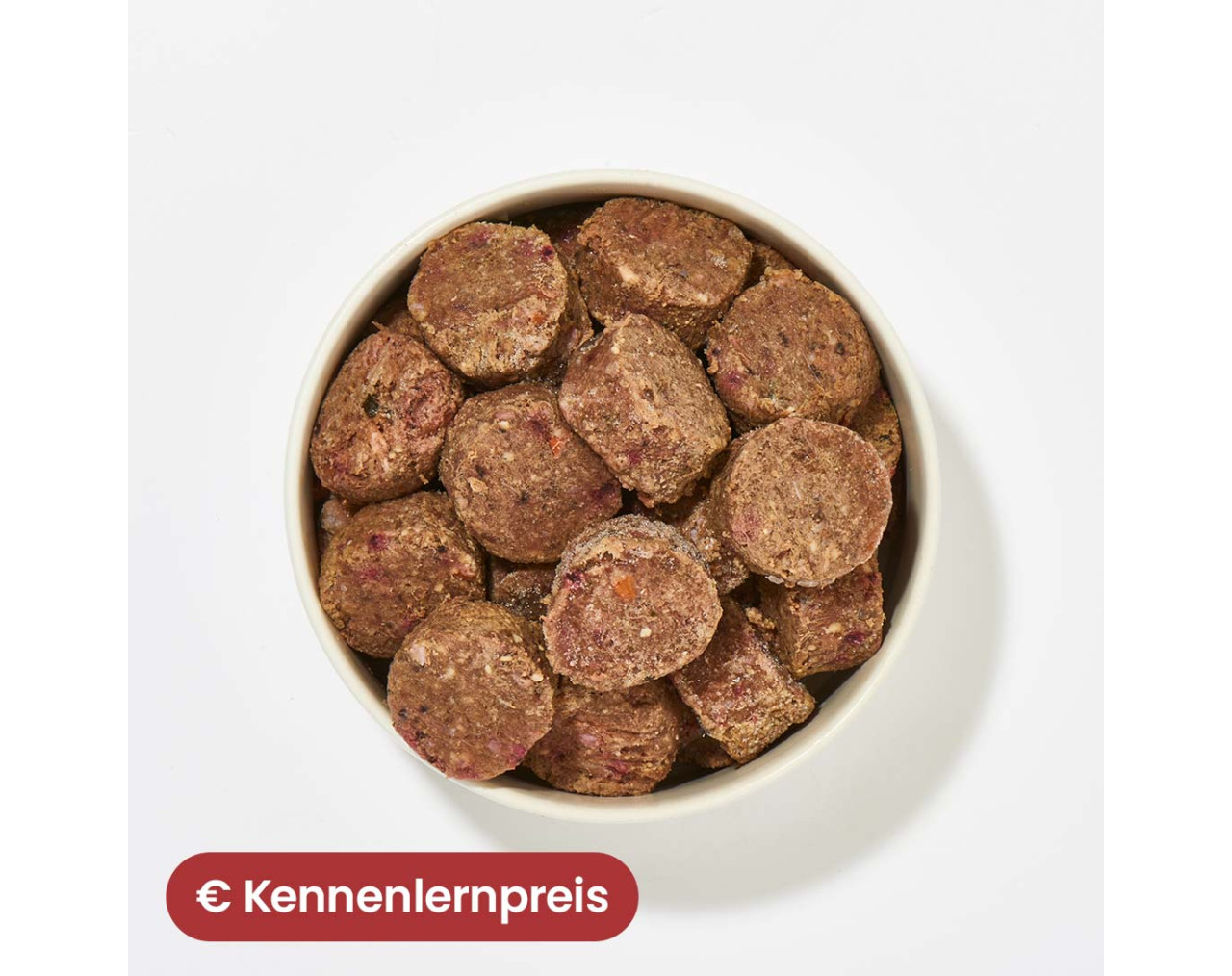 Unsere All-in-One-Nuggets Rind sind ein Komplettmenü welches alle Nährstoffe enthält, die dein vierbeiniger Freund benötigt, sodass du überhaupt nichts mehr hinzufügen musst. Dadurch wird sichergestellt, dass dein Hund alle erforderlichen Vitamine, Mineralien und Proteine erhält, um gesund und vital zu bleiben. Dieses Produkt eignet sich also perfekt für BARF Einsteiger, da diese Art von Rohfütterung keinerlei Vorwissen, Recherche oder eigenständige Menüplanung benötigt.