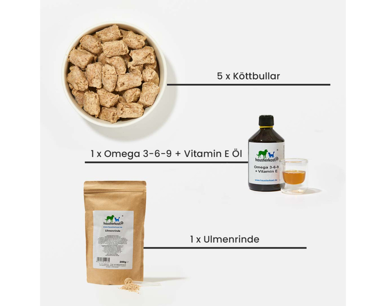 Das perfekte Starterpaket für Deinen kleinen Vierbeiner! Unser BARF-Futterumstellungs-Paket ist ideal für Hunde bis 5 kg und enthält alles, was Dein Hund für den Einstieg in die artgerechte Rohfütterung benötigt. Das Paket umfasst: 3 Päckchen a 1 kg Köttbullar Rind mit Gemüse 2 Päckchen a 1 kg Köttbullar Huhn & Lachs mit Pansen 1 Päckchen a 250 ml Omega 3-6-9 + Vitamin E Öl 1 Päckchen a 100 g Ulmenrinde Die Köttbullar sind ein hochwertiges, leicht portionierbares Alleinfuttermittel, das zusammen mit unserem Omega 3-6-9 + Vitamin E Öl zur Unterstützung von Haut und Fell sowie einer Packung Ulmenrinde für eine gesunde Verdauung geliefert wird. Die Ulmenrinde ist besonders wertvoll bei der Futterumstellung, da ihre schleimbildenden und entzündungshemmenden Bestandteile die Schleimhäute von Magen und Darm unterstützen. Sie kann dabei helfen, die natürliche Magen- und Darmtätigkeit zu harmonisieren und sorgt so für einen sanften Übergang auf die neue Ernährung. So gelingt der Umstieg auf BARF gesund und stressfrei!