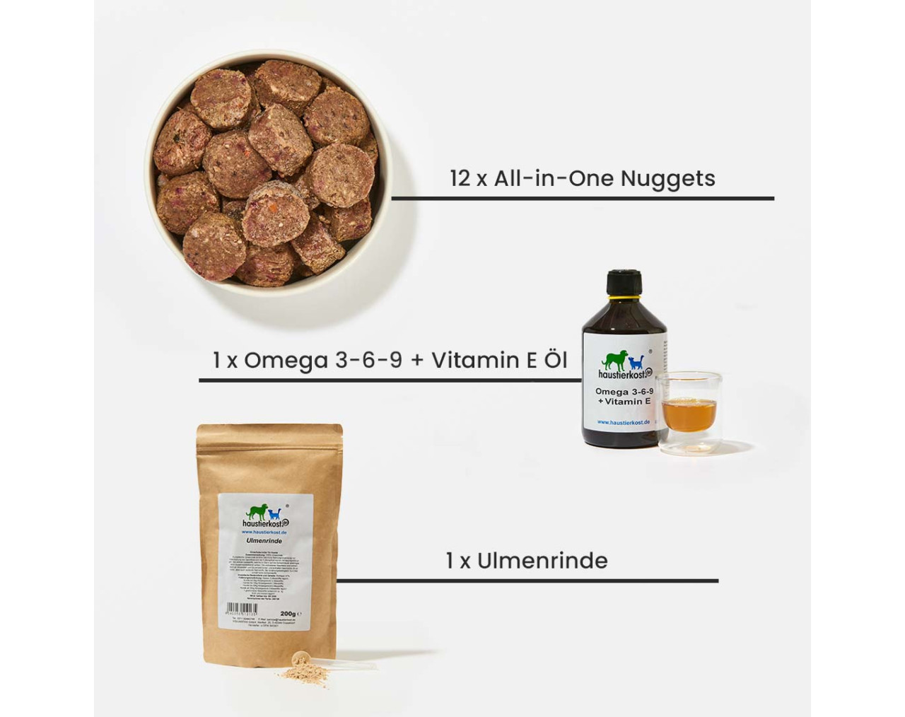 Das perfekte Starterpaket für Deinen kleinen Vierbeiner! Unser BARF-Futterumstellungs-Paket ist ideal für Hunde bis 10 kg und enthält alles, was Dein Hund für den Einstieg in die artgerechte Rohfütterung benötigt. Das Paket umfasst: 6 Päckchen a 750 g All-in-One Nuggets Rind 6 Päckchen a 750 g All-in-One Nuggets Huhn 1 Päckchen a 250 ml Omega 3-6-9 + Vitamin E Öl 1 Päckchen a 200 g Ulmenrinde Die All-in-One Nuggets sind ein hochwertiges, leicht portionierbares Alleinfuttermittel, das zusammen mit unserem Omega 3-6-9 + Vitamin E Öl zur Unterstützung von Haut und Fell sowie einer Packung Ulmenrinde für eine gesunde Verdauung geliefert wird. Die Ulmenrinde ist besonders wertvoll bei der Futterumstellung, da ihre schleimbildenden und entzündungshemmenden Bestandteile die Schleimhäute von Magen und Darm unterstützen. Sie kann dabei helfen, die natürliche Magen- und Darmtätigkeit zu harmonisieren und sorgt so für einen sanften Übergang auf die neue Ernährung. So gelingt der Umstieg auf BARF gesund und stressfrei!