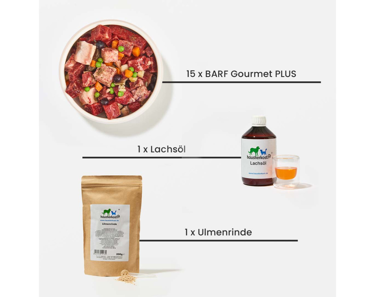 Das perfekte Starterpaket für Deinen kleinen Vierbeiner! Unser BARF-Futterumstellungs-Paket ist ideal für Hunde bis 20 kg und enthält alles, was Dein Hund für den Einstieg in die artgerechte Rohfütterung benötigt. Das Paket umfasst: 8 Päckchen a 800 g BARF Gourmet PLUS Rind 7 Päckchen a 800 g BARF Gourmet PLUS Huhn 1 Päckchen a 500 ml Lachsöl 1 Päckchen a 200 g Ulmenrinde Das BARF Gourmet PLUS ist ein hochwertiges, leicht portionierbares Fertigbarf, das zusammen mit unserem Lachsöl zur Unterstützung von Haut und Fell sowie einer Packung Ulmenrinde für eine gesunde Verdauung geliefert wird. Die Ulmenrinde ist besonders wertvoll bei der Futterumstellung, da ihre schleimbildenden und entzündungshemmenden Bestandteile die Schleimhäute von Magen und Darm unterstützen. Sie kann dabei helfen, die natürliche Magen- und Darmtätigkeit zu harmonisieren und sorgt so für einen sanften Übergang auf die neue Ernährung. So gelingt der Umstieg auf BARF gesund und stressfrei!