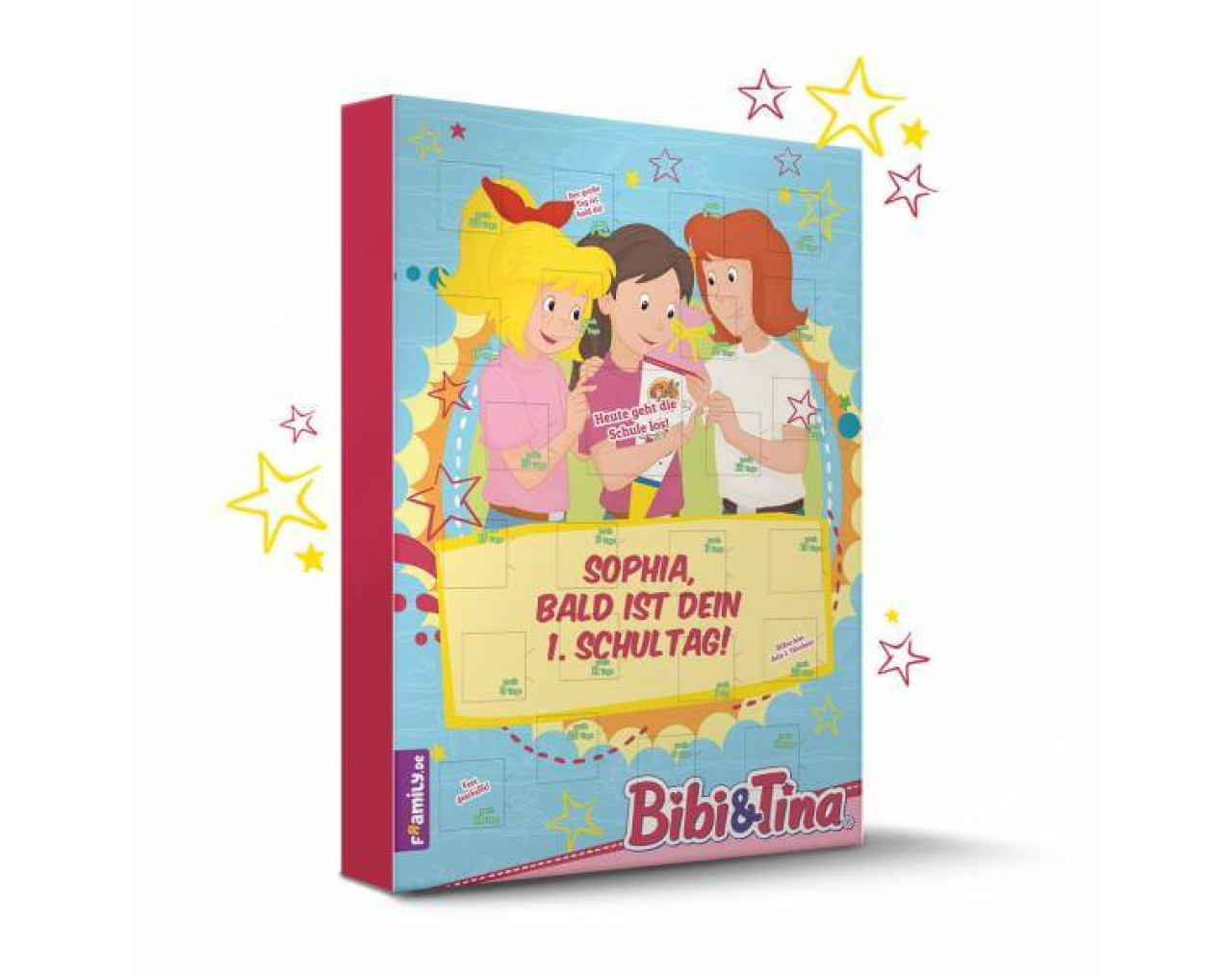"Eene meene ohne Stopp, Schule startet im Galopp. Hex-hex!" Große Aufregung, Vorfreude und Spannung pur – dein Schulanfang ist etwas ganz Besonderes, und mit den 24 Türchen des Bibi & Tina Schulstart-Kalenders versüßt du dir die Wartezeit. Bibi und Tina begleiten dich – jeden Tag kannst du eine kleine Überraschung entdecken, wie bei einem Adventskalender. Dabei lernst du die Zahlen von 1 bis 24 kennen und – WOW – auf der Kalender-Rückseite gibt es auch viel Spannendes zu entdecken: deinen ersten Stundenplan, eine Checkliste für den ersten Schultag und Ausschneide-Figuren. Gib jetzt deinen Namen, dein Aussehen und auf Wunsch ein Foto ein und bestelle den Bibi & Tina Schulstart-Kalender für deinen Schulanfang! Weitere Informationen zu unserer Füllung findest du hier: Haribo-Fruchtgummi Aufgepasst: Wir drucken de...