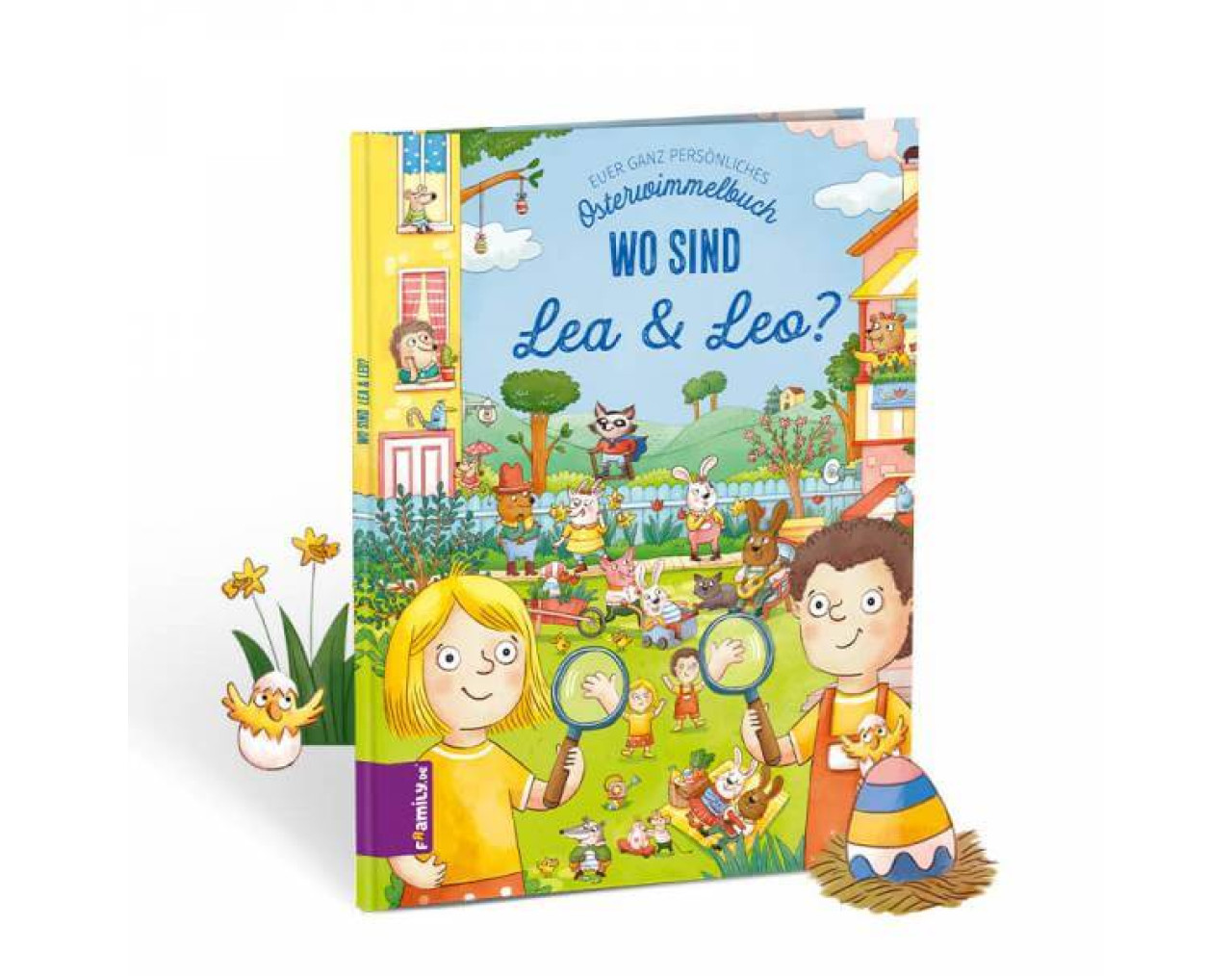 Entdeckt euch selbst auf eurer personalisierten Osterreise in die Wimmelstadt! In eurem personalisierten Osterwimmelbuch könnt ihr nicht nur Ostereier, kleine Küken und viele weitere Überraschungen und Gegenstände auf den einzelnen Wimmelbildern entdecken. Hier gilt vor allem: Sucht euch selbst und habt Spaß dabei! Und damit ihr euch in den einzelnen Suchbildern auch wiederfindest, dürft ihr uns einiges über euer Aussehen verraten. Und seid ihr Geschwister oder Zwillingsschwestern oder -brüder, Freunde oder Freundinnen, Cousins oder Cousinen? In jedem Fall verwöhnen euch die Bewohner der Wimmelstadt mit eurem Lieblingseis und ihr dürft Ostereier in einer Lieblingsfarbe bemalen. Öffnet jetzt die Adleraugen und begebt euch auf eine heitere Suche nach euch selbst! Aufgepasst: Wir drucken euer Buch in unserer Werkstatt genau nach Angaben. Achte...