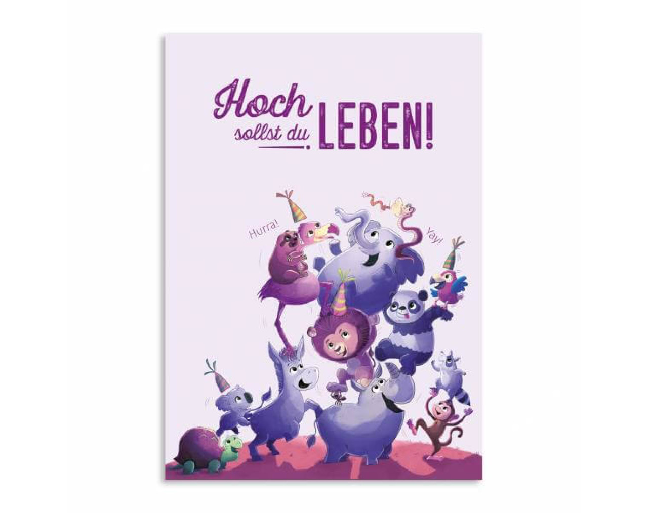 Grußkarte " Hoch sollst du leben!" Die bezaubernde Grußkarte "Hoch sollst du leben!" ist ideal, um Glückwünsche zu einem besonderen Anlass zu übermitteln. Mit ihrem verspielten Design in lila und pink zeigt die Karte unsere fröhlichen Tiere, die gemeinsam eine Feier organisieren. Diese Karte ist perfekt, um Geburtstagskindern und anderen Jubilaren eine besondere Freude zu bereiten und sie hochleben zu lassen! Details zur Grußkarte : - Format: DIN A6 (10,5 x 14,8 cm) - Papierstärke: 300 g, matt - Papier: PEFC-zertifiziert