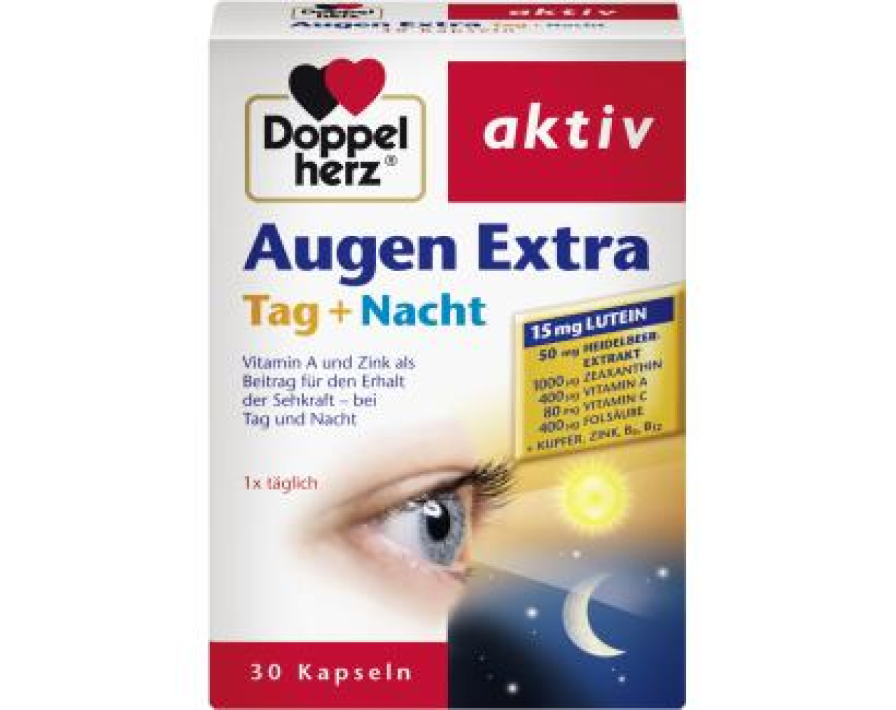 Das Auge ist eines der erstaunlichsten Organe des menschlichen Körpers und ist Tag und Nacht gefordert. Arbeiten am Computer, häufiges Fernsehen und nächtliche Autofahrten sind besonders anstrengend für das Auge. Für die Gesundheit, den Erhalt der Sehfunktion sowie die Sehkraft des Auges bei Tag und Nacht spielen verschiedene Faktoren eine Rolle. Hierzu zählt auch die gute Versorgung mit Nährstoffen. Die Kapseln von Doppelherz enthalten die Vitamine A, C und E, wertvolle B-Vitamine sowie die Spurenelemente Zink und Kupfer kombiniert mit Lutein sowie Zeaxanthin. Zusätzlich enthalten ist ein Extrakt aus Heidelbeerfrüchten.