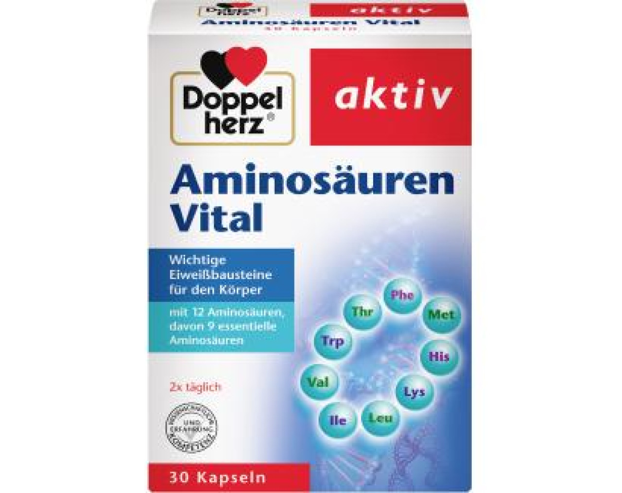 Aminosäuren sind die kleinste Basis von Eiweißen (Proteinen) und sind als Baustein in allen Körperzellen enthalten. Sie gelten als unentbehrlich für zahlreiche Stoffwechselvorgänge, darunter fallen auch der Transport und die Speicherung von Nährstoffen. Der Bedarf an Aminosäuren ist von mehreren Faktoren abhängig und kann mit körperlicher Belastung, unausgewogener Ernährungsweise oder Stress steigen. Über die Nahrung nimmt der Mensch verschiedene Eiweiße (Proteine) über beispielsweise Fleisch, Fisch, Ei oder Soja auf. Diese Proteine werden im Körper in ihre Bestandteile, die sogenannten Aminosäuren, zerlegt und dann gemäß eines bestimmten Bauplans wieder zu Körperprotein umgewandelt. So entsteht aus Nahrungsprotein strukturbildendes Körperprotein. Daher werden Aminosäuren auch als „Bausteine des Lebens bezeichnet. Der menschliche Körper besteht aus hunderten von Proteinen. Für den Aufbau von körpereigenen Proteinen werden jedoch nur 21 Aminosäuren benötigt. Grundsätzlich lassen sich diese Aminosäuren in essentielle (kann der Körper nicht selbst bilden) und nicht-essentielle (kann der Körper selbst bilden) Aminosäuren unterscheiden. Doppelherz Aminosäuren Vital liefert mit L-Valin, L-Leucin, L-Isoleucin, L-Threonin, L-Methionin, L-Phenylalanin, L-Tryptophan, L-Lysin und L-Histidin alle 9 essentiellen Aminosäuren. Zusätzlich ist die Aminosäure L-Arginin enthalten, die der Körper in bestimmten Bedarfssituationen und Belastungsbedingungen nicht in ausreichenden Mengen bilden kann. Ferner enthält eine Kapsel die nicht-essentiellen Aminosäuren L-Tyrosin und L-Cystein. Bei einer unzureichenden Zufuhr an Aminosäuren kann die Ernährung mit Doppelherz Aminosäuren Vital gezielt ergänzt werden. Weitere Informationen erhalten Sie unter folgendem Link: https://pim.doppelherz.de/de/product/708/708_BPZ.pdf