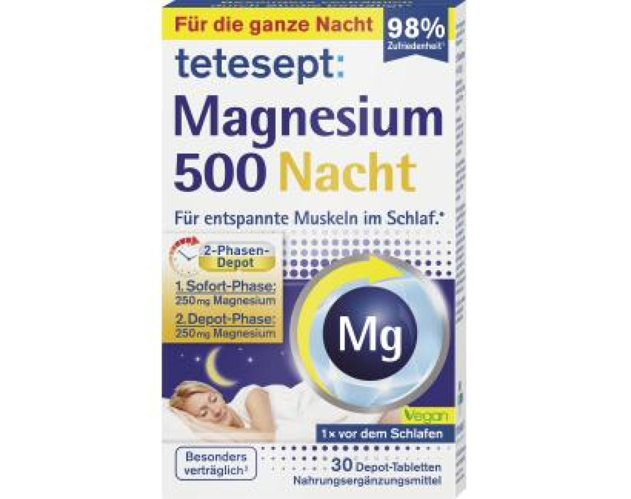 Unsere Muskeln und Nerven werden aufgrund besonderer Herausforderungen in Sport, Beruf und Alltag täglich in hohem Maße beansprucht. In der Nacht sind entspannte Muskeln, aber auch innere Ruhe jedoch eine wichtige Voraussetzung für erholsamen Schlaf. Eine ausreichende Versorgung mit Nährstoffen kann helfen, den menschlichen Organismus zu unterstützen. tetesept Magnesium 500 Nacht versorgt den Körper mit hochdosiertem Magnesium. Dieses trägt bei: zu einer normalen Muskelfunktion,, zu einer normalen Funktion des Nervensystems.