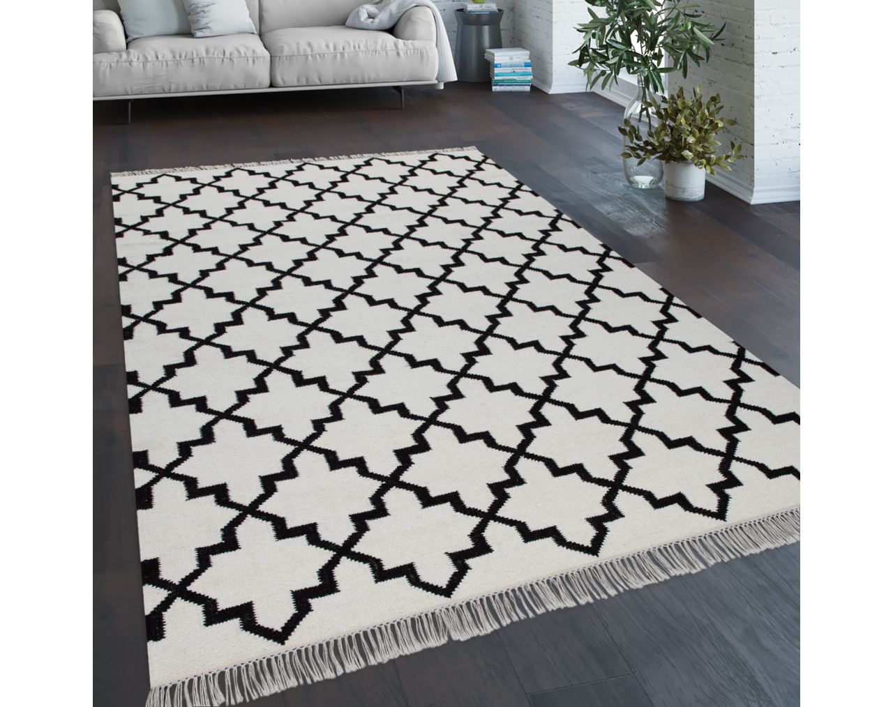 Verwandle deinen Raum mit diesem eleganten Teppich, der das zeitlose Schwarz und Weiß mit einem klassischen marokkanischen Design vereint. Dieser Teppich ist nicht nur ein edler Hingucker, sondern schafft auch eine warme und gemütliche Atmosphäre. Sein orientalisches Muster sorgt dafür, dass er in keiner Umgebung untergeht und bereichert jeden Raum, egal ob Wohn- oder Schlafzimmer. Der Teppich ist handgefertigt und besticht durch seine hochwertige Verarbeitung. Er ist auch sehr widerstandsfähig und pflegeleicht, was dir eine lange Lebensdauer garantiert. So wird dieser Teppich schnell zu deinem neuen Lieblingsstück. Hol dir ein Stück Exotik nach Hause und genieße das luxuriöse Gefühl, das er unter deinen Füßen hinterlässt.