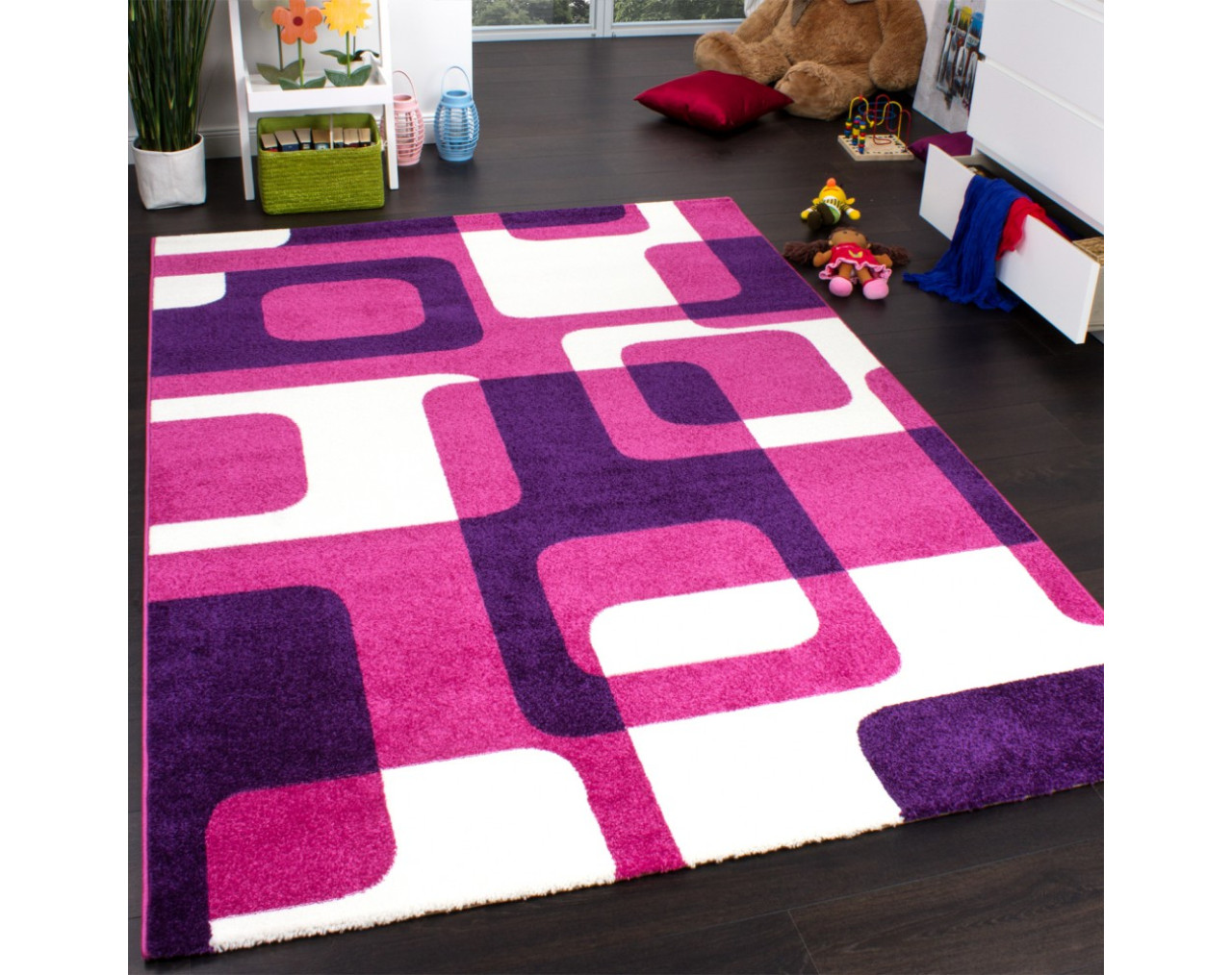 Lass dich von der lebendigen Farbexplosion dieses Teppichs im Retro-Stil begeistern! Ein echter Hingucker, der mit seinem auffallenden Design in Pink, Lila und Weiß jeden Raum zum Strahlen bringt. Seine abgerundeten Ecken sind mehr als nur ein Detail, sie verleihen deinem Zuhause eine dynamische Note. Ein echtes Designerstück, das deine Räume mit neuem Leben erfüllt. Du wirst überrascht sein, wie robust und pflegeleicht dieser Teppich ist. Er ist sogar für Fußbodenheizungen geeignet. Also, warum nicht mal etwas Neues ausprobieren und deinem Wohnraum einen frischen, lebendigen Look verleihen? Stell dir vor, wie gut dieser Teppich mit stilvollen Extras, wie alten Filmpostern in Edelstahlrahmen oder Beistelltischen mit abgerundeten Ecken, harmoniert. Ein echtes Highlight, das deinem Zuhause das gewisse Etwas verleiht.